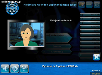 | Czy Jesteś Mądrzejszy Od 5-klasisty - Każdy z zawodników powinien poprawnie odpowiedzieć na jedenaście pytań. Do dyspozycji mamy pomocnika 5-klasistę którego możemy wybrać, wybrany uczeń postara się pomóc kiedy udzielimy błędnej odpowiedzi. Podczas gry możemy również skorzystać ze "ściągi" lub "gotowca" . Jeśli uczestnik nie potrafi tego zrobić lub doszedł do etapu, na którym chce zatrzymać wygraną (wirtualne pieniądze - punkty), musi powiedzieć jedno magiczne zdanie: "Nie jestem mądrzejszy od piątoklasisty". | ||